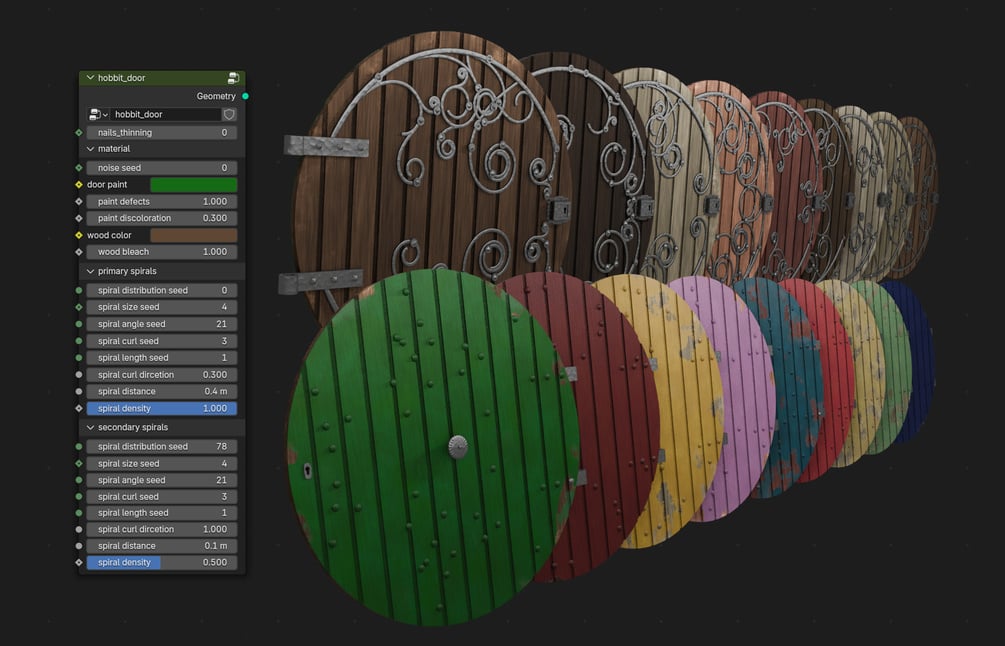 A geometry nodes setup in blender, which allows you to create custom hobbit doors. It comes with 9 premade doors, with good looking seeds / settings (from the video). But you can procedurally generate an infinite amount of different doors, by changing the seeds and settings. You just have to fiddle around a bit until you find a combination you like.